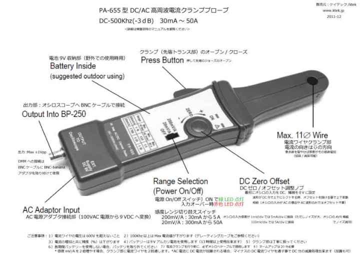 | * 電流プローブの出力はオシロスコープ(又は、デジタルマルチメーター/DMM)へ繋ぎ計測します | |||||